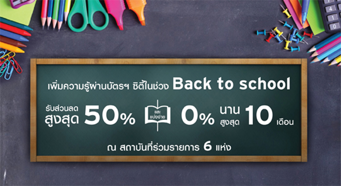 Back to school รับส่วนลดสูงสุด 50% และแบ่งจ่าย 0% นานสูงสุด 10 เดือน เมื่อใช้จ่ายผ่านบัตรฯ ซิตี้