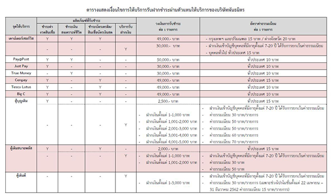 ตารางแสดงเงื่อนไขการให้บริการรับฝากชำระผ่านตัวแทนให้บริการของบริษัทพันธมิตร