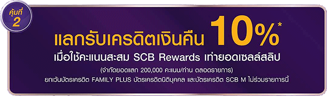 - สิทธิ์ที่ 2 แลกรับเครดิตเงินคืน 10% เมื่อใช้คะแนนสะสม SCB Rewards เท่ายอดเซลล์สลิป ยกเว้นบัตรเครดิตแฟมิลี่พลัส บัตรเครดิตนิติบุคคล และบัตรเครดิต SCBM ไม่สามารถรับสิทธิ์นี้