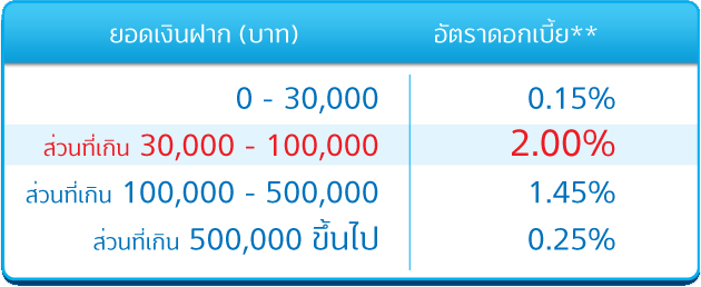 - ธนาคารคำนวณดอกเบี้ยเป็นรายวันจากยอดเงินคงเหลือ ณ สิ้นวัน ของอัตราดอกเบี้ยตามวงเงินที่ประกาศในขณะนั้น โดยธนาคารจะจ่ายดอกเบี้ยทุกวันที่ 25 ของทุกเดือน