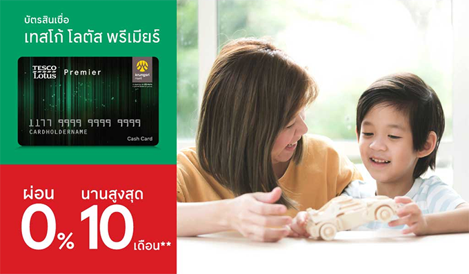 - บัตรสินเชื่อเทสโก้ โลตัส พรีเมียร์ ผ่อนชำระประกันภัยที่ร่วมรายการอัตราดอกเบี้ย 0% นานสูงสุด 10 เดือน และมียอดผ่อนชำระขั้นต่ำ 300 บาทต่อเดือน
