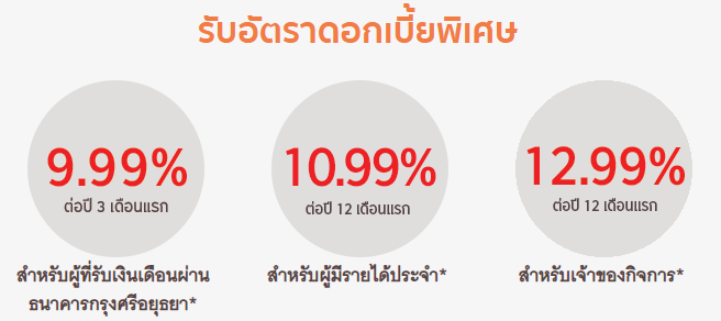 เงื่อนไขการรับอัตราดอกเบี้ยพิเศษ - อัตราดอกเบี้ย 9.99% ต่อปี 3 เดือนแรก สำหรับพนักงานประจำที่รับเงินเดือนผ่านบัญชีของธนาคารกรุงศรีอยุธยา / มีอายุงาน 1 ปีขึ้นไป / มีรายได้ตามหลักเกณฑ์ของธนาคารกรุงศรีอยุธยา และรับเงินกู้โดยวิธีโอนเงินเข้าบัญชีเงินฝากธนาคารเท่านั้น