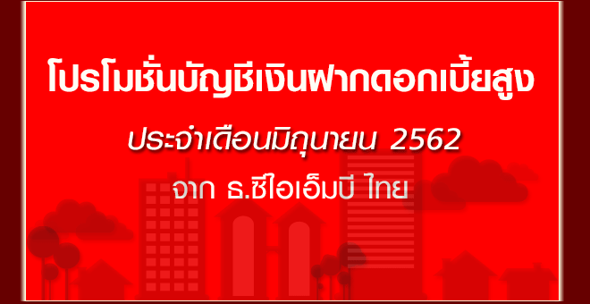 โปรโมชั่นบัญชีเงินฝากดอกเบี้ยสูงประจำเดือนมิถุนายน 2562 จาก ธนาคารซีไอเอ็มบี ไทย บัญชีเงินฝากประจำแบบมีกำหนดระยะเวลาที่ให้ดอกเบี้ยสูง และสามารถเลือกรับดอกเบี้ยแบบรายเดือน หรือเมื่อครบกำหนดได้