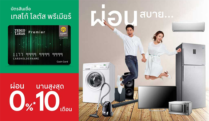 บัตรสินเชื่อเทสโก้ โลตัส พรีเมียร์ ผ่อนนานสบาย ผ่อนเครื่องใช้ไฟฟ้าภายในบ้าน - 0% นานสูงสุด 10 เดือน เฉพาะสินค้าที่ร่วมรายการ