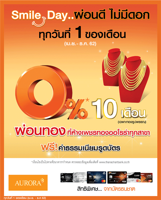 สิทธิพิเศษสำหรับลูกค้า บัตรเครดิตธนชาต รับสิทธิ์ผ่อนทองรูปพรรณ 0% นาน 10 เดือน ที่ห้างเพชรทองออโรร่าทุกสาขา (ฟรี! ค่าธรรมเนียมการรูดบัตร)