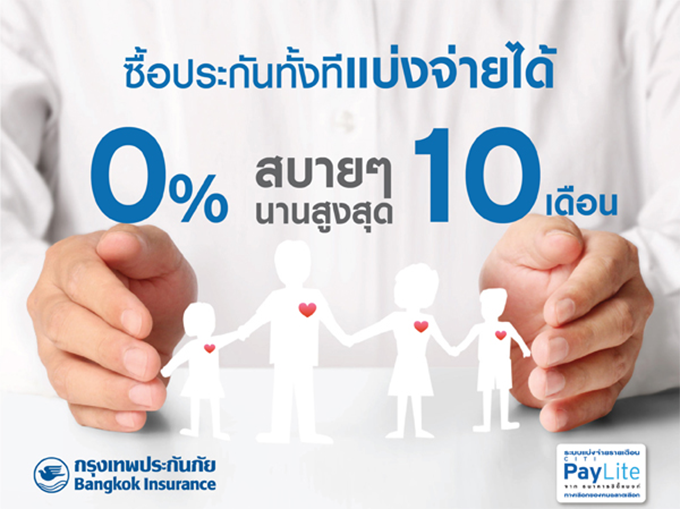 อภิสิทธิ์เฉพาะสมาชิกบัตรเครดิตซิตี้ และบัญชีซิตี้ เรดดี้เครดิต เมื่อซื้อประกันภัยรถยนต์กับกรุงเทพประกันภัย รับสิทธิ์แบ่งจ่ายรายเดือน Citi PayLite 0% นานสูงสุด 10 เดือน