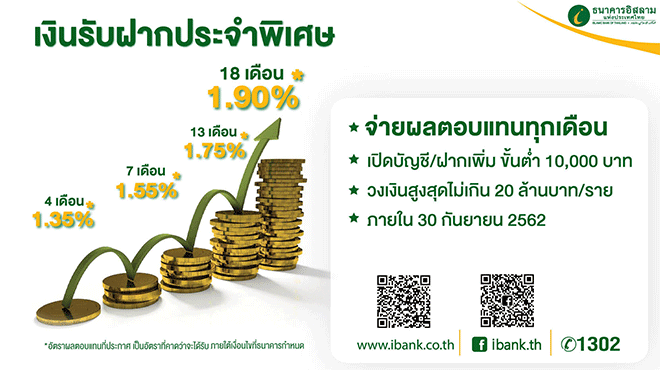 โครงการเงินรับฝากประจำพิเศษ ผลตอบแทนสูงสุด 1.90% ต่อปี จากธนาคารอิสลาม