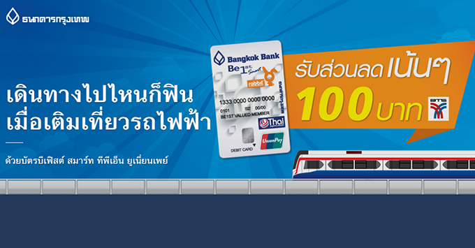 รับส่วนลดเน้นๆ 100 บาท เมื่อเติมเที่ยวรถไฟฟ้า BTS ตั้งแต่ 300 บาทขึ้นไป ผ่านบัตรบีเฟิสต์ สมาร์ท ทีพีเอ็น ยูเนี่ยนเพย์ หรือบัตรเครดิตยูเนี่ยนเพย์ ธนาคารกรุงเทพ ตั้งแต่ 1 มิ.ย. 62 - 30 พ.ย. 62