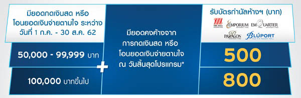 "กดเงินสด หรือ โอนยอดเงินจ่ายตามใจ รับบัตรกำนัลสูงสุดมูลค่า 800 บาท"