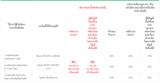 - หลังจากสิ้นสุดระยะเวลาอัตราดอกเบี้ยพิเศษ 0% นาน 60 วันหรือ 90 วัน (แล้วแต่กรณี) อัตราดอกเบี้ยพิเศษ จะถูกปรับเป็นอัตราดอกเบี้ยปกติตามวงเงินสินเชื่อบัตรเงินด่วน Xpress Cash ที่ลูกค้าได้รับอนุมัติ
