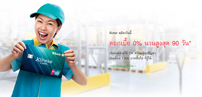 - อัตราดอกเบี้ยพิเศษ 0% นาน 90 วัน สำหรับลูกค้าผู้มีบัญชีเงินเดือนผ่านกสิกรไทยและชำระเงินด้วยการหักบัญชีอัตโนมัติ ที่สมัครสินเชื่อบัตรเงินด่วน Xpress Cash พร้อมสมัครบริการเงินสดโอนไว Cash Day 1 เพื่อโอนเงินสินเชื่อขั้นต่ำ 50% ของวงเงินที่ได้รับอนุมัติ เข้าบัญชีออมทรัพย์ธนาคารกสิกรไทยของลูกค้าผู้กู้ และสมัครบริการชำระเงินโดยการหักบัญชีอัตโนมัติ Auto Payment เท่านั้น เพื่อชำระหนี้สินเชื่อบัตรเงินด่วน Xpress Cash และหลังจากสิ้นสุดระยะเวลา 90 วัน ของอัตราดอกเบี้ยพิเศษ 0% ธนาคารจะคิดดอกเบี้ยในอัตราดอกเบี้ยปกติตามวงเงินสินเชื่อบัตรเงินด่วน Xpress Cash ที่ลูกค้าได้รับอนุมัติ
