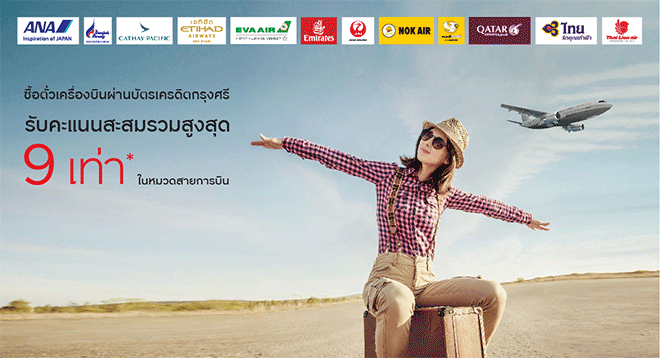 บัตรเครดิตกรุงศรี รับคะแนนสะสมรวมสูงสุด 9 เท่า ในหมวดสายการบิน*