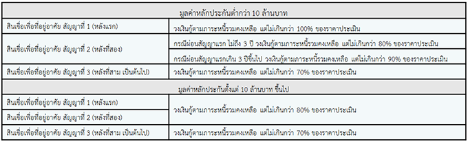 - ยกเว้น ค่าประเมินราคาหลักประกัน (ลูกค้าสำรองจ่ายค่าประเมินราคาหลักประกันก่อน และธนาคารจะดำเนินการโอนเงินคืนเข้าบัญชีลูกค้าที่เปิดไว้กับธนาคารหลังจากการทำนิติกรรมจดจำนองและเบิกเงินกู้เรียบร้อยแล้ว)
