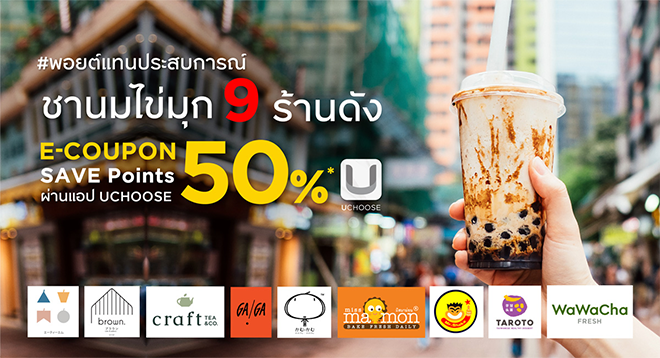 บัตรเครดิต กรุงศรี Save Point 50% แลกรับ E-Coupon ส่วนลด 50 บาท ผ่านแอปฯ UChoose กับ 9 ร้านชานมไข่มุก ร้านดัง ATM Tea Bar, Craft Tea & Co, Brown Cafe', Ga Ga, KAMU, Miss Mamon, Mr. Shake, Taroto, Wawa Cha