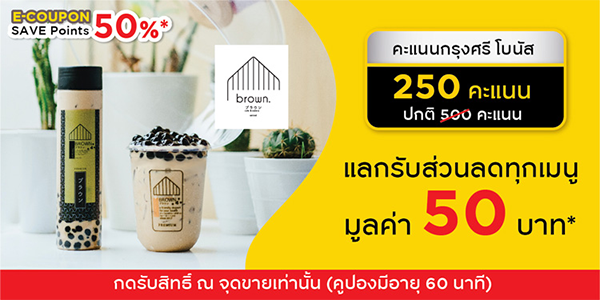 2. E-COUPON Brown Cafe' : แลกรับส่วนลดทุกเมนู มูลค่า 50 บาท ใช้ 250 พอยต์ จากปกติ 500 พอยต์ Brown Cafe' มี 8 สาขา ร่วมรายการทุกสาขา >> สาขาสยาม, สาขาชิดลม, สาขาสีลม, สาขาปิ่นเกล้า, สาาอีสต์วิลล์, สาขาไอคอนสยาม, สาขาเมกาบางนา และสาขาเชียงใหม่