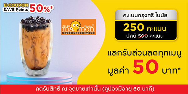 6. E-COUPON Miss Mamon : แลกรับส่วนลดทุกเมนู มูลค่า 50 บาท ใช้ 250 พอยต์ จากปกติ 500 พอยต์ Miss Mamon มี 10 สาขา ร่วมรายการทุกสาขา >> สาขาตลาดลุงเพิ่ม หลังการบินไทย ซอยวิภาวดีฯ 22, สาขาบ้านแอนด์บียอน ราชพฤกษ์ ชั้น 1 (ตรงข้ามธนาคารกสิกรไทย), สาขาเซ็นทรัลพระราม 3 ชั้น G โซนพลาซ่า, สาขาเซ็นทรัลพระราม 2 ชั้น 3 (เยื้องธนาคารกรุงไทย), สาขาโฮมโปร พระราม 3 ชั้น 1, โฮมโปรพระราม 9 ชั้น G, สาขาโฮมโปร กัลปพฤกษ์, สาขาเกตเวย์ แอท บางซื่อ ชั้น G, สาขาสีลมคอมเพล็กซ์ ชั้น B และสาขาโฮมโปร จรัญสินทวงศ์ ชั้น G