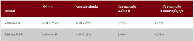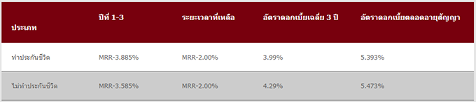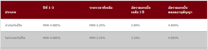 - กรณีสมัครทำประกันชีวิต ต้องสมัครทำประกันชีวิตขั้นต่ำ 70% ของวงเงินสินเชื่อ ระยะเวลาความคุ้มครองขั้นต่ำ 10 ปี สูงสุดไม่เกินระยะเวลากู้ กรณีกู้ไม่ถึง 10 ปี