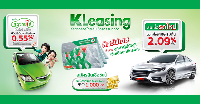 เงื่อนไข - สำหรับลูกค้าที่สมัครสินเชื่อรถใหม่ ระหว่างวันที่ 1 ก.ค. - 31 ธ.ค. 2562 ได้รับอนุมัติและเกิดเป็นสัญญาเช่าซื้อภายในวันที่ 31 ม.ค. 2563 เฉพาะลูกค้าที่เลือกใช้แคมเปญดอกเบี้ยพิเศษสำหรับผู้มีบัญชีเงินเดือนผ่านธนาคารกสิกรไทย (K-Payroll) ตามอัตราดอกเบี้ยที่กำหนด โดยมีอัตราดอกเบี้ยเริ่มต้นเพียง 2.09% ต่อปี (อัตราดอกเบี้ยคงที่ต่อปี เฉพาะรุ่นรถยนต์ที่ร่วมรายการ) รับฟรี! บัตรกำนัลเทสโก้โลตัสมูลค่า 1,000 บาท และไม่ต้องมีผู้ค้ำประกัน