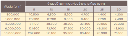- สบายๆ กับการผ่อนชำระนานสูงสุด 30 ปี (ระยะเวลาผ่อนชำระรวมกับอายุผู้กู้แล้วต้องไม่เกิน 65 ปี)