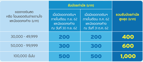 - พิเศษ! รับบัตรกำนัลมูลค่า 2x เมื่อมียอดกดเงินสด/โอนยอดเงินจ่ายตามใจติดต่อกันสองเดือน ระหว่างวันที่ 1-30 ก.ย. 62 และ 1-31 ต.ค. 62 และมียอดคงค้างติดต่อกันสองเดือน ณ วันที่ 30 ก.ย. และ 31 ต.ค. 62 ระหว่าง 30,000-49,999 บาท รับบัตรกำนัลรวม 400 บาท, ระหว่าง 50,000-99,999 บาท รับบัตรกำนัลรวม 600 บาท และ 100,000 บาทขึ้นไป รับบัตรกำนัลรวม 1,000 บาท