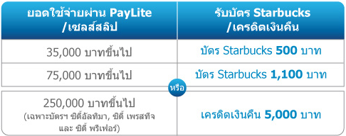 - ธนาคารฯ จะทำการจัดส่งบัตร Starbucks ไปตามที่อยู่เดียวกับใบแจ้งยอดและเครดิตเงินคืนเข้าบัญชีบัตรหลักภายใน 60 วันหลังสิ้นสุดรายการ