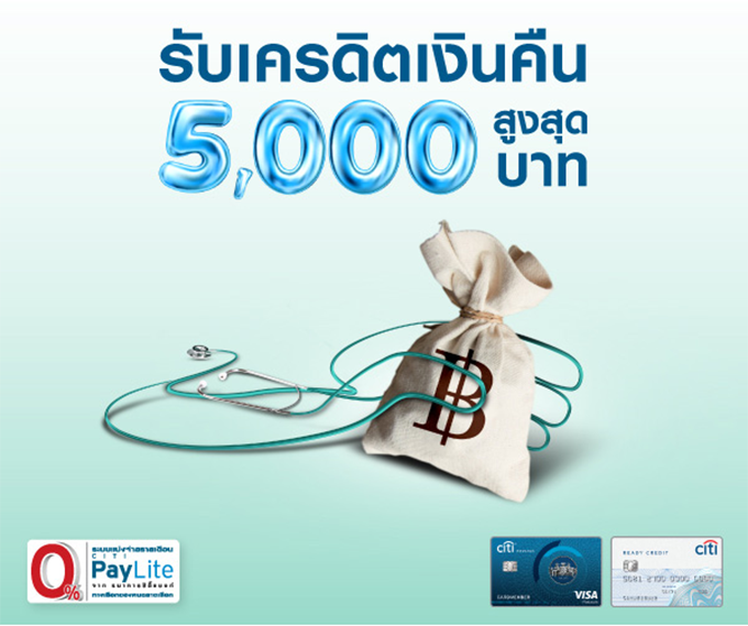 แบ่งจ่าย 0% นานสูงสุด 10 เดือนผ่าน Citi PayLite และ รับเครดิตเงินคืนสูงสุด 5,000 บาท ที่โรงพยาบาลและศูนย์การรักษาที่ร่วมรายการ เมื่อมียอดแบ่งจ่ายดังต่อไปนี้