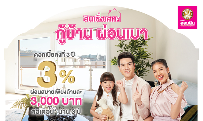สินเชื่อเคหะ กู้บ้าน ผ่อนเบา รับดอกเบี้ยคงที่ 3 ปี 3% ผ่อนเพียงล้านละ 3,000 บาท จาก ธ.ออมสิน