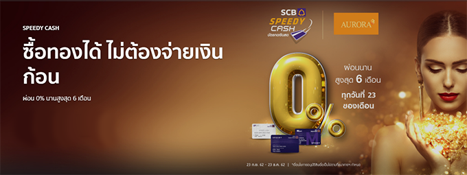 เงื่อนไข - สิทธิพิเศษสำหรับผู้ถือบัตร Speedy Cash และบัตรอัพทูมี Speedy Cash ธนาคารไทยพาณิชย์ จำกัด(มหาชน)("ธนาคาร") ที่มีหมายเลขบัตร 77777721 xxxxxxxx ("ผู้ถือบัตร") เมื่อใช้จ่ายผ่านบัตรที่ร้านห้างเพชรทองออโรร่า ทุกสาขาทั่วประเทศ ทุกวันที่ 23 ของเดือน ตั้งแต่เดือนกันยายน 2562 - เดือนธันวาคม 2562 รับสิทธิผ่อนชำระดอกเบี้ย 0% 6 เดือน เฉพาะสินค้าที่ร่วมรายการที่มียอดแบ่งจ่ายผ่านบัตร Speedy Cash และบัตรอัพทูมี Speedy Cash ยอดใช้จ่ายต่อเซลส์สลิปตั้งแต่ 3,000 บาท