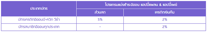 - บริษัทฯ จะเครดิตเงินคืนเข้าบัญชีบัตรภายใน 90 วัน นับแต่วันสิ้นสุดรายการส่งเสริมการขาย ในกรณีที่ยังไม่ได้รับเครดิตเงินคืนหรือเครดิตเงินคืนไม่ถูกต้อง โปรดแจ้งให้บริษัทฯ ทราบภายใน 30 วัน นับแต่พ้นระยะเวลาดังกล่าว กรณีที่ยอดเครดิตเงินคืนมากกว่ายอดแบ่งชำระรายเดือน บริษัทฯ จะเครดิตเงินคืนส่วนที่เหลือในรอบผ่อนชำระของเดือนถัดไป