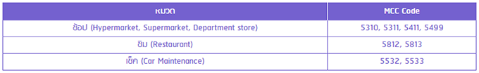 - รายการยอดใช้จ่ายที่ไม่ถูกนับรวมในรายการส่งเสริมการขายนี้ อาทิ การเบิก-ถอนเงินสดล่วงหน้า, โปรแกรมแบ่งชำระทุกประเภท, สินเชื่อประเภทเงินกู้ ดอกเบี้ย ค่าปรับ ค่าธรรมเนียมต่างๆ รายการที่ถูกยกเลิก (Void) และยอดใช้จ่ายที่เกิดจากการคืนสินค้าภายหลัง