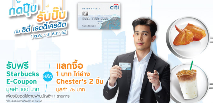 เงื่อนไข - สมาชิกบัญชีซิตี้ เรดดี้ เครดิต จ่ายเพียง 1 บาท แลกรับไก่ย่าง 2 ชิ้น มูลค่า 76 บาท ที่ร้าน Chester's ทุกสาขาที่ร่วมรายการ หรือ E-coupon มูลค่า 100 บาท ที่ร้าน Starbucks
