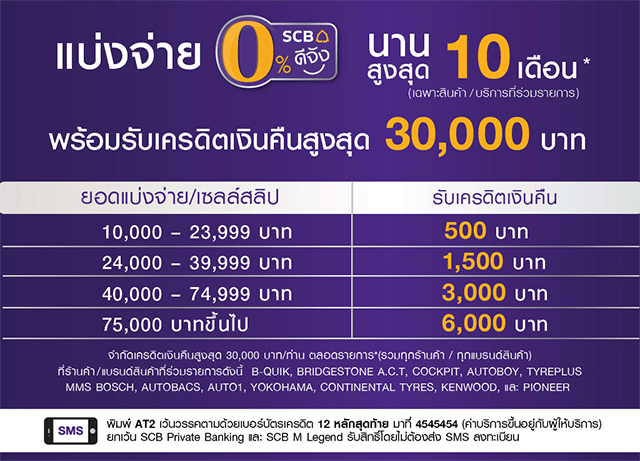- ผู้ถือบัตรต้องชำระค่าสินค้า/บริการ ที่ร่วมรายการด้วยบัตรเครดิตไทยพาณิชย์ และมียอดแบ่งจ่ายตามตารางที่แสดง ผ่านบัตรเครดิตใบที่ลงทะเบียน SMS เข้าร่วมรายการเพื่อรับเครดิตเงินคืน จำกัดเครดิตเงินคืนสูงสุด 30,000 บาท/ท่าน ตลอดรายการส่งเสริมการขายที่ร้านค้า/แบรนด์สินค้าที่ร่วมรายการ ดังนี้ B-QUICK, BRIDGESTONE A.C.T, COCKPIT, AUTOBOY, TYREPLUS, MMS BOSCH, AUTOBACS, AUTO1, YOKOHAMA, CONTINENTAL TYRES, KENWOOD และ PIONEER