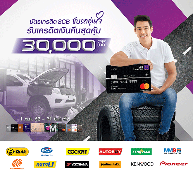 สิทธิพิเศษสำหรับ บัตรเครดิตไทยพาณิชย์ รับเครดิตเงินคืนสูงสุด 30,000 บาท* เมื่อชำระค่าสินค้า/บริการ กับร้านค้าในหมวดรถยนต์ที่ร่วมรายการ