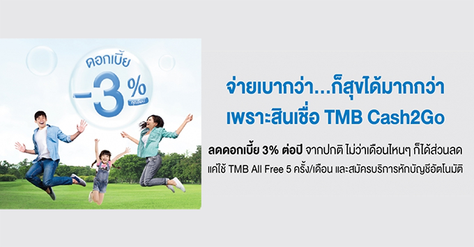 จ่ายเบากว่า...ก็สุขได้มากกว่า เพราะสินเชื่อ TMB Cash2Go ลดดอกเบี้ย 3% ต่อปี จากปกติ ไม่ว่าเดือนไหนๆ ก็ได้ส่วนลด แค่ใช้ TMB All Free 5 ครั้ง/เดือน และสมัครบริการหักบัญชีอัตโนมัติ