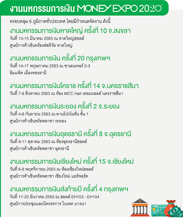 สำหรับการจัดงานมหกรรมการเงินประจำปี 2563 Money Expo 2020 จะจัดขึ้นใน 6 ภูมิภาคทั่วประเทศ โดยงานมหกรรมการเงิน Money Expo ที่จัดในกรุงเทพฯ คือ งานมหกรรมการเงิน ครั้งที่ 20 ที่ อิมแพ็ค เมืองทองธานี และ งานมหกรรมการเงินส่งท้ายปี ครั้งที่ 3 ที่ ไบเทค บางนา และงานมหกรรมการเงินในต่างจังหวัด คือ งานมหกรรมการเงินหาดใหญ่ ครั้งที่ 10, งานมหกรรมการเงินโคราช ครั้งที่ 14, งานมหกรรมการเงินระยอง ครั้งที่ 2, งานมหกรรมการเงินอุดรธานี ครั้งที่ 8 และ งานมหกรรมการเงินเชียงใหม่ ครั้งที่ 15