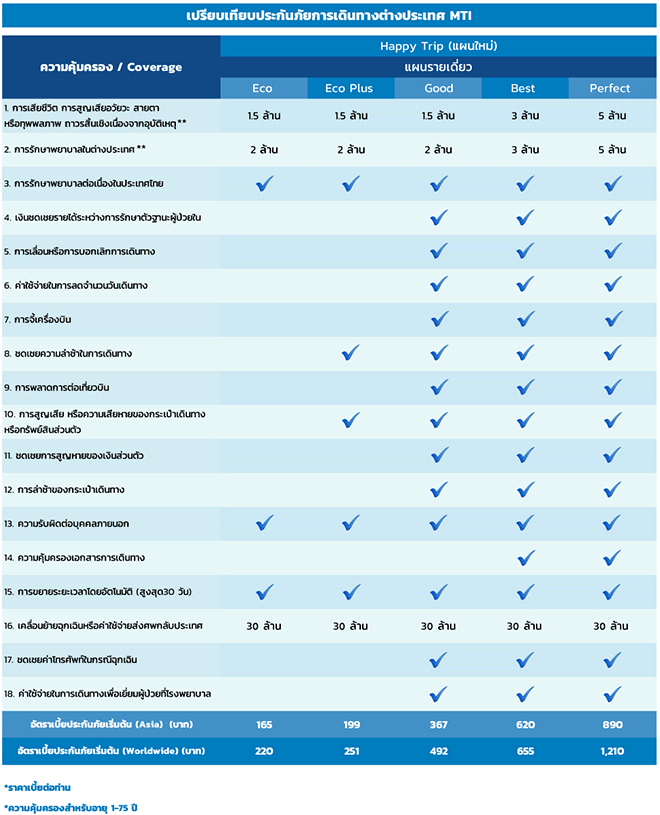 จะเที่ยวเอเชียใกล้ๆ หรือไปไกลถึงยุโรปก็เที่ยวได้ทุก Lifestyle กับประกันเดินทางต่างประเทศ เมืองไทย Happy Trip แผนรายเดี่ยว จากเมืองไทยประกันภัย สามารถเลือกได้หลากหลายรูปแบบ พร้อมรับโปรโมชั่น 2 ต่อ