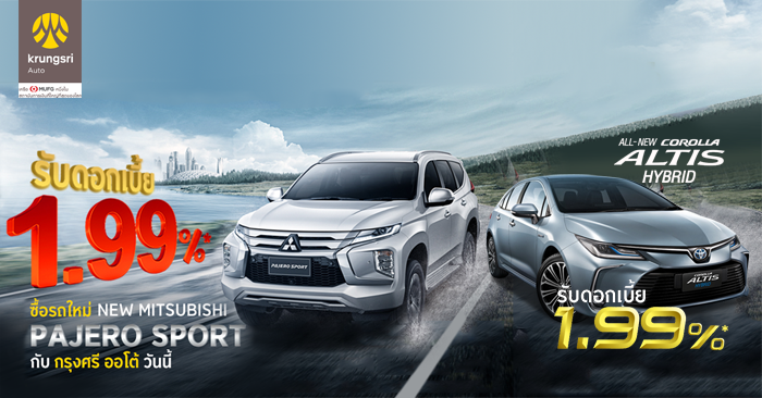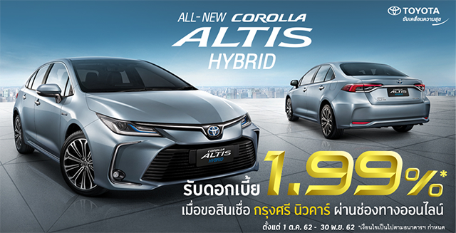 อัตราดอกเบี้ย พิเศษ - สำหรับลูกค้าบุคคลธรรมดาที่ขอสินเชื่อรถใหม่ โตโยต้า โคโรลล่า อัลติสใหม่ กับ กรุงศรี ออโต้ ผ่านช่องทางออนไลน์ของ กรุงศรี ออโต้ (www.krungsriauto.com, Krungsri Auto PromptStart, LINE Official Account และ Facebook) ระหว่างวันที่ 1 ตุลาคม 2562 ถึง 30 พฤศจิกายน 2562 และได้รับอนุมัติสินเชื่อเปนเลขที่สัญญา และรับรถภายใน 31 ธันวาคม 2562 ได้รับอัตราดอกเบี้ยพิเศษในอัตรา 1.99% สำหรับลูกค้าที่ชำระเงินดาวน์เริ่มต้นในอัตรา 25% ของราคารถยนต์ และผ่อนชำระค่าเช่าซื้อทั้งหมดเป็นจำนวน 48 งวดเท่านั้น