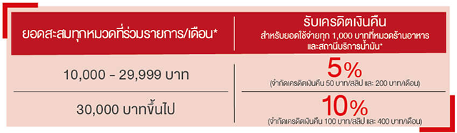 - กรณียอดใช้จ่ายสะสมต่อเดือนครบ 10,000-29,999 บาท รับเครดิตเงินคืนสำหรับยอดใช้จ่ายที่หมวดน้ำมันและร้านอาหารในเดือนนั้นๆ โดยทุก 1,000 บาทต่อเซลล์สลิป รับเครดิตเงินคืน 50 บาท จำกัดเครดิตเงินคืนสูงสุดไม่เกิน 50 บาทต่อเซลล์สลิป และ 200 บาทต่อหมายเลขบัญชีบัตรหลักต่อเดือน