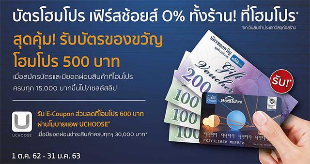 เงื่อนไขรายการส่งเสริมการขาย - สำหรับลูกค้าที่สมัครบัตรโฮมโปร เฟิร์สช้อยส์ ที่เป็นบัตรใหม่เฉพาะบัตรหลักที่ได้รับอนุมัติ ตั้งแต่วันที่ 1 ตุลาคม 2562 - 31 มกราคม 2563 และมียอดผ่อนสินค้าตั้งแต่ 15,000 บาทขึ้นไป / ใบเสร็จ ณ โฮมโปร ทุกสาขา ภายใน 45 วัน นับจากวันอนุมัติ (ไม่รวมการกดเงินสด) รับ บัตรของขวัญ โฮมโปร มูลค่า 500 บาท