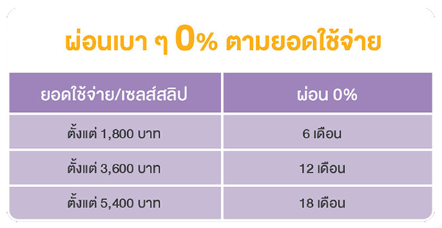- ยอดใช้จ่ายต่อเซลส์สลิป ตั้งแต่ 1,800 บาทขึ้นไป สำหรับระยะเวลาผ่อนชำระ 6 เดือน