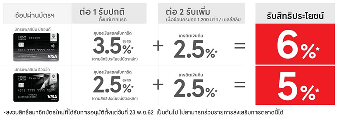 - รับเพิ่มเครดิตเงินคืน 2.5%* เมื่อช้อปครบทุก 1,200 บาท/เซลล์สลิป รับเครดิตเงินคืน 30 บาท จำกัดยอดใช้จ่ายสูงสุด 6,000 บาท หรือเครดิตเงินคืนสูงสุด 150 บาท/บัญชีบัตรหลัก/เดือน (จำกัดเครดิตเงินคืนรวมสูงสุด 450 บาท/บัญชีบัตรหลัก/ตลอดรายการ หรือ ยอดใช้จ่ายสูงสุด 18,000 บาท/บัญชีบัตรหลัก/ตลอดรายการ) ที่เทสโก้ โลตัส ทุกสาขา ได้แก่ เทสโก้ โลตัส ไฮเปอร์มาร์เก็ต, เทสโก้ โลตัส เอ็กซ์ตร้า, เทสโก้ โลตัส ดีพาร์ทเม้นท์สโตร์, เทสโก้ โลตัส ช้อป ออนไลน์, เทสโก้ โลตัส ตลาด และเทสโก้ โลตัส เอ็กซ์เพรส
