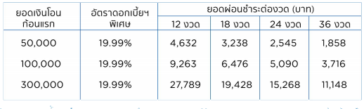 *อัตราดอกเบี้ยฯ คำนวณแบบลดต้นลดดอก (Effective Rate) 19.99% ต่อปี หรือเปรียบเทียบเป็นอัตราดอกเบี้ยฯ คงที่แบบประมาณการ (Flat Rate) 0.93% ต่อเดือน