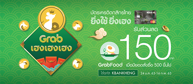 บัตรเครดิตกสิกรไทย ยิ่งใช้ยิ่งเฮง รับส่วนลด GrabFood 150 บาท เมื่อมียอดสั่งซื้อ 500 บาทขึ้นไป โดยใส่รหัส