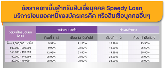 - อัตราดอกเบี้ยสำหรับสินเชื่อบุคคล Speedy Loan บริการโอนยอดหนี้ฯ เฉพาะลูกค้าที่ได้รับการอนุมัติวงเงินสินเชื่อบุคคล Speedy Loan และสมัครใช้บริการโอนยอดหนี้ของบัตรเครดิตอื่นๆ หรือ สินเชื่อบุคคลอื่นๆ ยอดสินเชื่อคงค้างอาจน้อยกว่ายอดหนี้ที่ท่านต้องการโอน ทั้งนี้ขึ้นอยู่กับหลักเกณฑ์การอนุมัติที่ธนาคารกำหนด