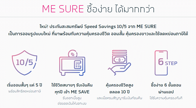 หมายเหตุ : ประกัน ME SURE เป็นชื่อทางการตลาดของแบบประกันสะสมทรัพย์ Speed Savings 10/5 โดยผลิตภัณฑ์ประกันชีวิตเป็นของบริษัท เอฟดับบลิวดี ประกันชีวิต จำกัด (มหาชน) ทั้งนี้ ME by TMB และธนาคารทหารไทย จำกัด (มหาชน) เป็นเพียงนายหน้าประกันชีวิต และรับผิดชอบในฐานะนายหน้าเท่านั้น ผู้ซื้อควรทำความเข้าใจรายละเอียดความคุ้มครองและเงื่อนไข ก่อนตัดสินใจทำประกันภัยทุกครั้ง การพิจารณารับประกันเป็นไปตามเงื่อนไขของ บมจ.เอฟดับบลิวดี ประกันชีวิต ธนาคารสงวนสิทธิ์ในการเปลี่ยนแปลงเงื่อนไขโปรโมชั่นต่างๆ โดยไม่ต้องแจ้งให้ทราบล่วงหน้า