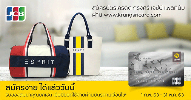 สมัครบัตรเครดิต กรุงศรี เจซีบี แพลทินัม ผ่านช่องทาง www.krungsricard.com และมียอดใช้จ่ายผ่านบัตรครบ 5,000 บาทขึ้นไป ภายใน 30 วัน หลังจากบัตรได้รับการอนุมัติ (ยอดใช้จ่ายสะสมผ่านบัตรไม่นับรวมการซื้อกองทุนรวม, ยอดกดเงินสดหรือยอดบริการเงินด่วนสั่งได้ (Krungsri Call For Cash) และค่าเบี้ยประกันทุกประเภท)