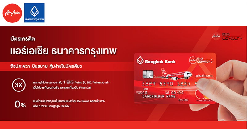รับสิทธิ์เป็นสมาชิกระดับ Platinum ของ AirAsia BIG Loyalty ทันที ทุก 1 ริงกิตมาเลเซีย หรือ 10 บาทไทยโดยประมาณ รับคะแนน BIG Points สูงสุด 7 เท่า สำหรับการเดินทางด้วยสายการบินแอร์เอเชียทั่วโลก - รับคะแนนสูงสุด 5.5 BIG Points เมื่อชำระค่าบัตรโดยสารประเภท Low Fare - รับคะแนน 7 BIG Points เมื่อชำระค่าบัตรโดยสารประเภท Premium Flex / Premium Flat Bed การรักษาสถานะสมาชิก Platinum - เมื่อมีการใช้จ่ายผ่านบัตรเครดิตแอร์เอเชีย 100,000 บาทต่อปี โดยต้องมียอดใช้จ่ายกับสายการบินแอร์เอเชีย อย่างน้อย 5,000 บาทต่อปี (นับยอดใช้จ่าย 12 เดือน นับจากเดือนที่บัตรได้รับการอนุมัติของทุกปี) - หากมียอดใช้จ่ายผ่านบัตรไม่เป็นไปตามเงื่อนไข AirAsia BIG Loyalty ขอสงวนสิทธิ์การนับจำนวนเที่ยวบินที่สมาชิกเดินทางกับสายการบินอย่างเดียวเท่านั้น
