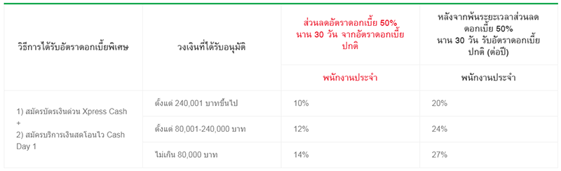 - หลังจากสิ้นสุดระยะเวลาส่วนลดอัตราดอกเบี้ย 50% นาน 30 วันแล้ว อัตราดอกเบี้ยพิเศษจะถูกปรับเป็นอัตราดอกเบี้ยปกติตามวงเงินสินเชื่อบัตรเงินด่วน Xpress Cash ที่ลูกค้าได้รับอนุมัติ