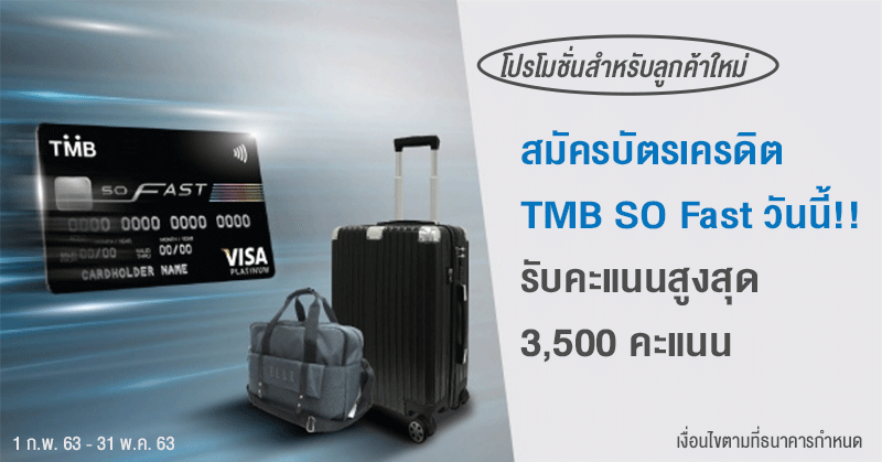บัตรเครดิต ทีเอ็มบี โซ ฟาสต์ (TMB So Fast Credit Card) วันนี้!! รับคะแนนพิเศษสูงสุด 3,500 คะแนน เมื่อมียอดใช้จ่ายผ่านบัตรครบตามเงื่อนไข ภายใน 60 วัน นับจากวันที่บัตรได้รับการอนุมัติฯ