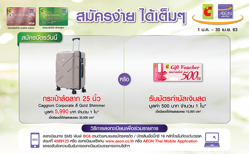 - รับกระเป๋าล้อลาก Caggioni Corporate (Gold Shimmer) ขนาด 25 นิ้วมูลค่า 5,990 บาท จำนวน 1 ใบ เมื่อมียอดอิออน แฮปปี้ เพย์ (ยอดผ่อนชำระ) / เบิกถอนเงินสดสะสมครบ 20,000 บาท ภายใน 60 วัน นับจากวันที่ได้รับอนุมัติบัตร - ผู้ถือบัตรเครดิตและบัตรสินเชื่อต้องลงทะเบียนเข้าร่วมรายการส่งเสริมการขายผ่านช่องทางที่บริษัทฯกำหนดภายใน 60 วัน นับจากวันที่ได้รับอนุมัติบัตร โดยลงทะเบียน 1 ครั้ง / หมายเลขบัตรเครดิตหรือบัตรสินเชื่อบิ๊กซี ดังนี้